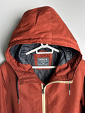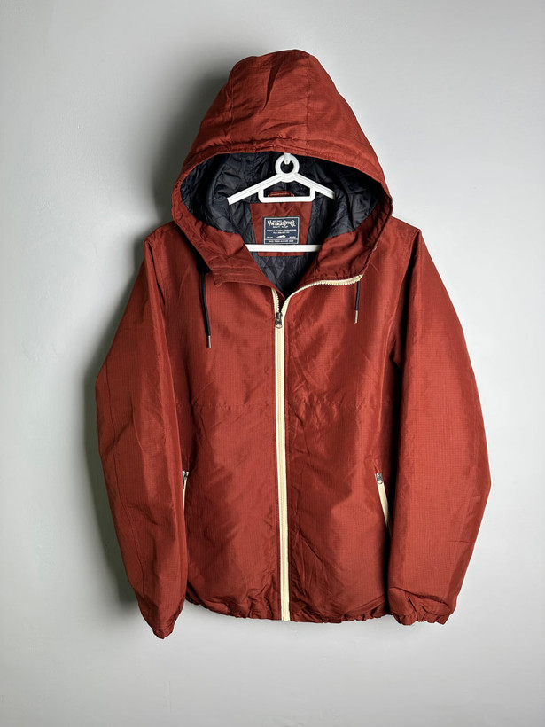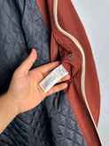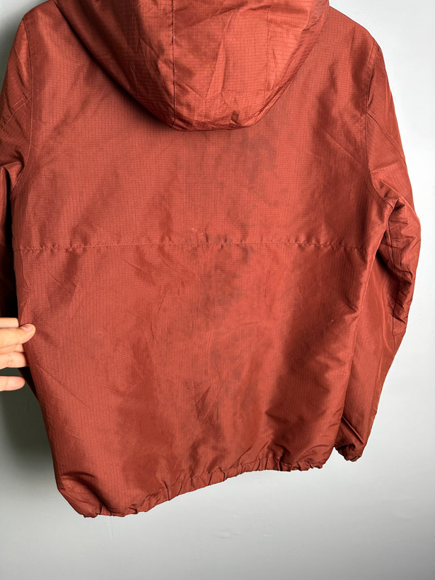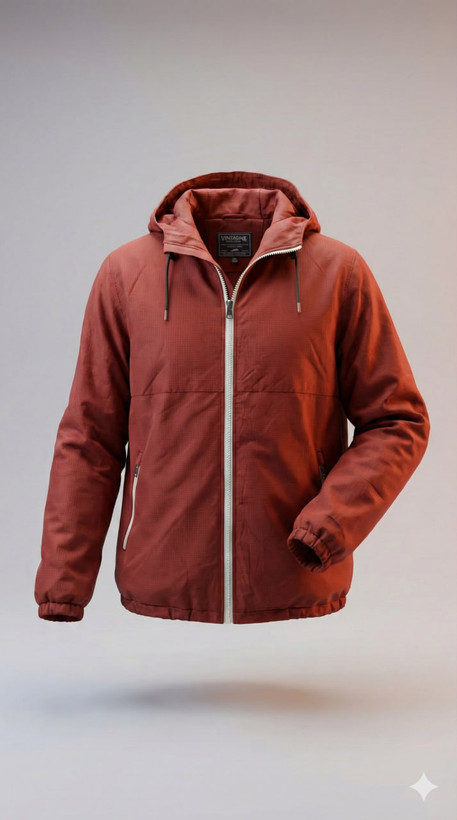 طراحی و ظاهر: رنگ این کاپشن، یک آجری (Rust/Brick Red) بسیار جذاب و گرم است که در استایلهای پاییزی به خوبی میدرخشد و با شلوارهای جین آبی تیره یا کتان مشکی تضاد رنگی فوقالعادهای ایجاد میکند. بافت پارچه رویه دارای الگوی ریز چهارخانه (احتمالاً Ripstop) است که علاوه بر زیبایی، به مقاومت پارچه در برابر پارگی و سایش کمک میکند. زیپ اصلی به رنگ سفید/کرم انتخاب شده که کنتراست زیبایی با بدنه قرمز رنگ کاپشن ایجاد کرده و حس اسپرت بودن را تقویت میکند.