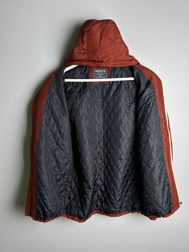 کیفیت و کارایی: داخل کاپشن، به خصوص در بخش کلاه، دارای آستر دوزی لوزیشکل (Quilted Lining) به رنگ سرمهای یا مشکی است. این لایه دوزی نشاندهنده وجود عایق حرارتی است که گرمای بدن را به خوبی حفظ میکند. وجود کلاه متصل با بندهای تنظیمکننده و یقه ایستاده، محافظت کاملی در برابر باد و سرما برای گردن و سر فراهم میکند. همچنین، دو جیب زیپدار در طرفین تعبیه شده که برای گرم نگهداشتن دستها و حمل ایمن وسایل کوچک بسیار کاربردی است.