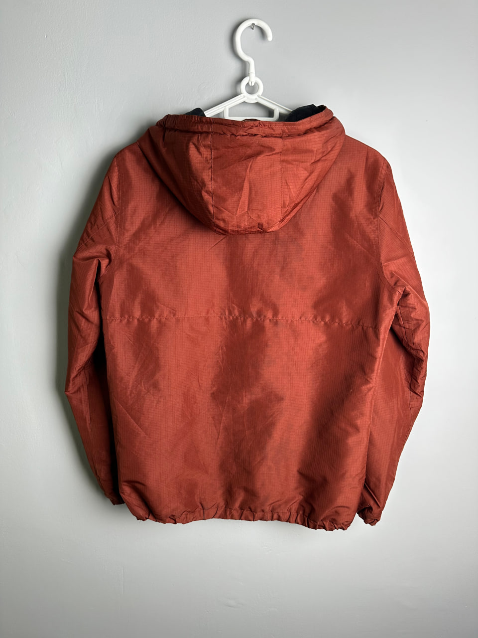 طراحی و ظاهر: رنگ این کاپشن، یک آجری (Rust/Brick Red) بسیار جذاب و گرم است که در استایلهای پاییزی به خوبی میدرخشد و با شلوارهای جین آبی تیره یا کتان مشکی تضاد رنگی فوقالعادهای ایجاد میکند. بافت پارچه رویه دارای الگوی ریز چهارخانه (احتمالاً Ripstop) است که علاوه بر زیبایی، به مقاومت پارچه در برابر پارگی و سایش کمک میکند. زیپ اصلی به رنگ سفید/کرم انتخاب شده که کنتراست زیبایی با بدنه قرمز رنگ کاپشن ایجاد کرده و حس اسپرت بودن را تقویت میکند.